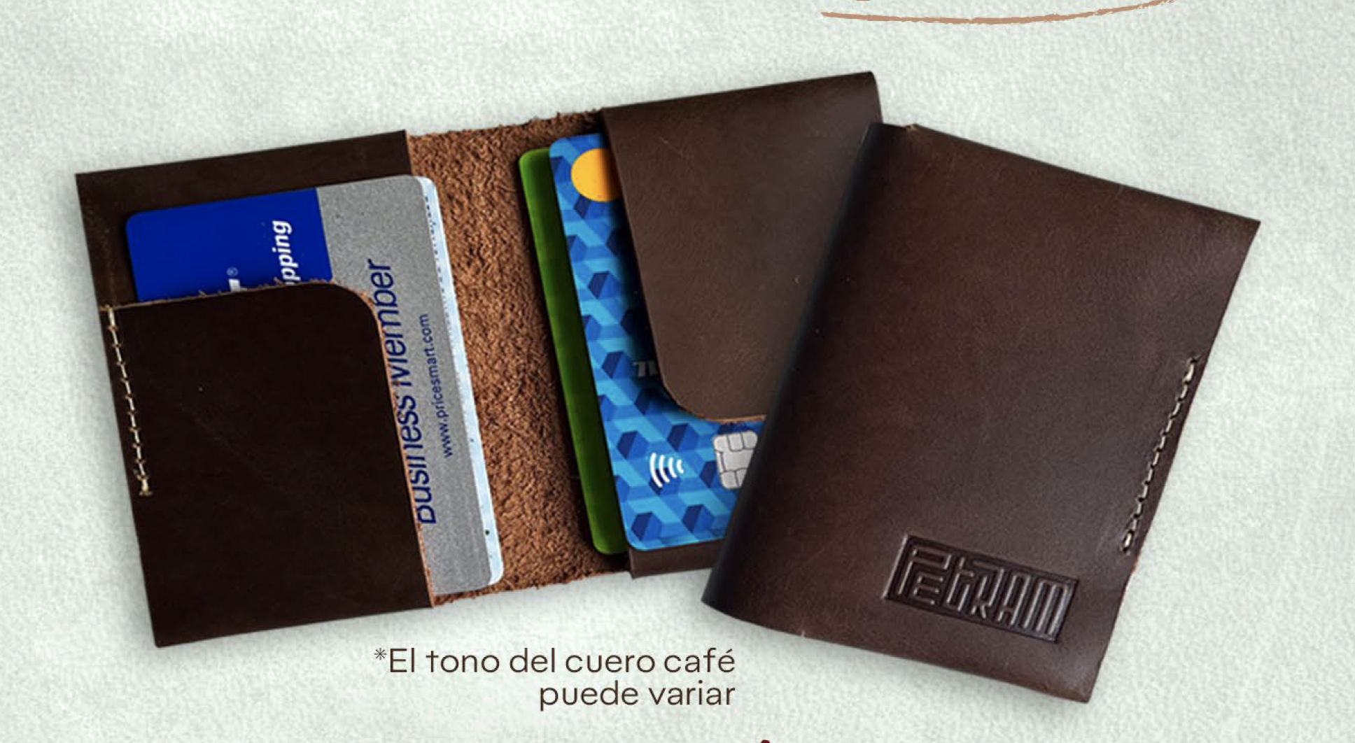 Tarjetero de cuero café tipo libreta. El tono del cuero café puede variar.